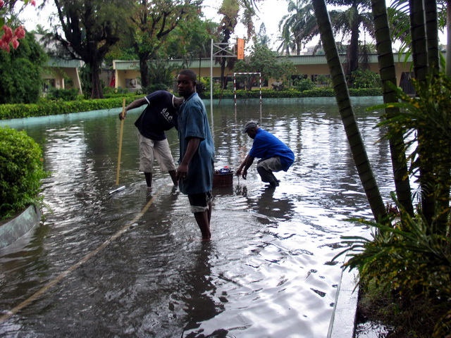 Der gesamte Innenhof der DSL war vollgelaufen und die Kanalisation hatte ob der Massen an H2O bereits den Dienst quittiert. In der Regenzeit ist dies zunächst nichts wirklich ungewöhnliches, doch dieses Mal schwappte das Nass bis in die Klassenräume und Büros. An die 30 Zentimeter Pegelstand konnte man in manchen Örtlichkeiten messen.